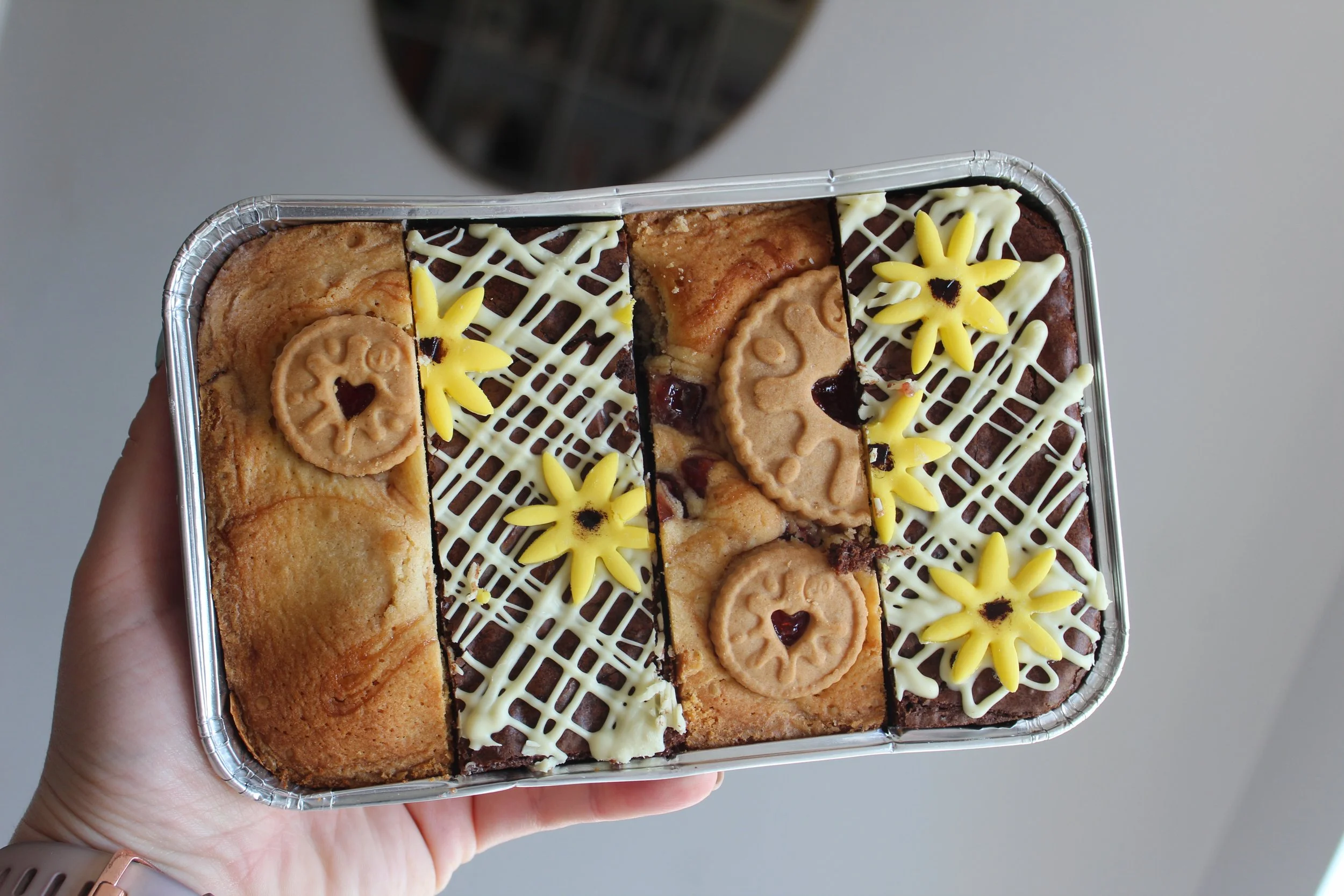 Blondie- White chocolate, unsalted butter, eggs, sugar, plain flour, vanilla extract, jammy dodgers, raspberry/strawberry jam.
